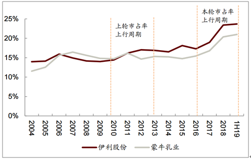 2010-2019年上行周期中伊利市场份额不断提升