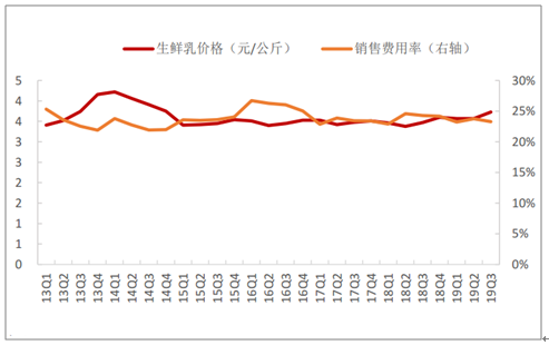 生鲜乳价格与销售费用率呈反向关系