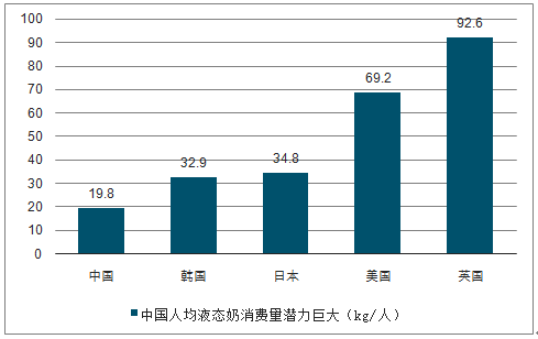 中国人均液态奶消费量潜力巨大(kg/人)
