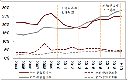 2010-2019年上行周期中伊利费用率有压缩趋势