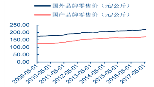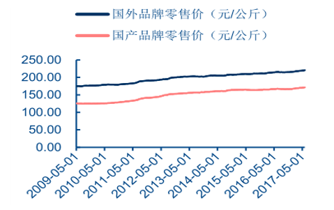 产品高端化占比提升,安全性、品牌优先度高于价格。近年来我国居民收入稳步提高,2016 年城镇居民可支配收入为 33616 元,同比上升 7.8%,带动婴幼儿消费提高,家庭婴幼儿人均消费额由 2007 年的 4260 元增至 2015 年的 12308 元。奶粉需求逐渐高端化,奶粉均价持续提升,2017 年6 月国内国外奶粉均价为 171 元/公斤及 221 元/公斤,分别同比增长 2.4%及 2.8%。在购买奶粉的时,安全性、品牌逐渐成为消费者选购婴幼儿奶粉的主要关注点。据数据显示,婴儿处于不同龄段时父母选购奶粉关注点有侧重:一段奶粉(0-6 个月)强调安全、品牌对品质要求较高,价格较为不敏感;二段奶粉(6-12 个月)处于奶粉消费,对安全、品牌关注度进一步提高;三段奶粉(1-3 周岁)仍强调安全、品牌,但因逐步摄入辅食与正餐,消费压力增大后价格优先度有所提升。