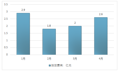 2017年1-4月,我国主要食品饮料品牌网络广告总投放费用为9.3亿元。