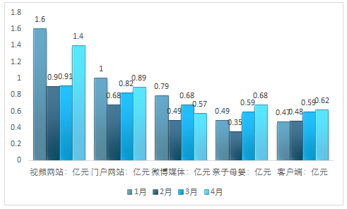 2017年1-4月,按类别来看,视频网站共投放费用4.81亿元,门户网站共投放3.39亿元,微博媒体共投放2.53亿元,亲子母婴共投放2.11亿元,客户端共投放2.16亿元。