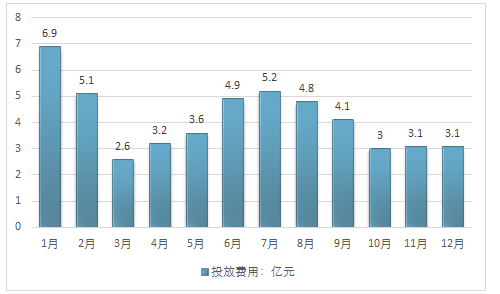 2015年,食品饮料品牌网络广告总投放费用达50.7亿元。以下是1-12月各月份食品饮料品牌网络广告投放费用: