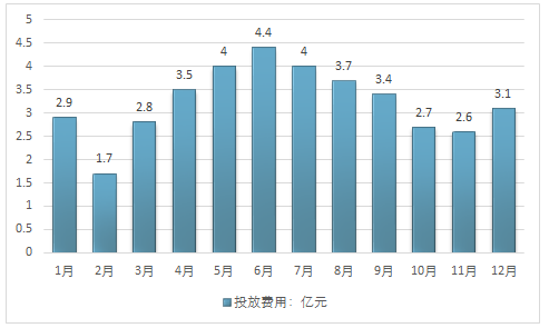 2016年,食品饮料品牌网络广告总投放费用达亿元49.6亿元。以下是1-12月各月份食品饮料品牌网络广告总投放费用: