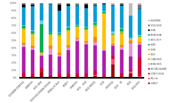 在电视节目类型的投放选择上,单元剧/连续剧、新闻/时事、娱乐是三大主要投放选择。而细分到不同的子小类,在投放节目类型的选择方面,也由于自身类别特征呈现不同的投放偏好。例如即饮•咖啡主要选择投放电影节目,奶茶投放集中在娱乐节目,茶包/茶叶子小类主要选择投放新闻/时事和纪录片/科技两类节目。