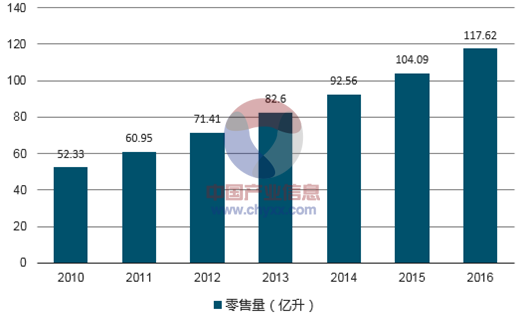 2009-2015年间,我国功能饮料行业零售量年均复合增长率约为13.11%。2010年我国功能性饮料的零售量为52.33亿升,2016年,我国功能性饮料零售量达到了117.62亿升。预计到2020年,我国功能饮料零售量将达到150.37亿升。