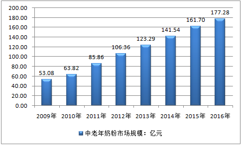 除了雀巢、恒天然等国外厂商,包括三元、飞鹤、伊利、欧世蒙牛等国内主流品牌都推出了中老年配方奶粉。相对于婴儿配方奶粉的复杂成分表,中老年配方奶粉成分则相对简单,多以补铁、钙、锌等微量元素和补充维生素的配料为主,大部分产品则注重健康性,主打低糖、低脂,价格也从几十元到百元左右。消费者逐渐开始接受配方奶粉的营养优于单纯牛奶,因此中老年配方奶粉市场有明显的提升。2016年,我国中老年奶粉的市场规模测算约为177.28亿元。