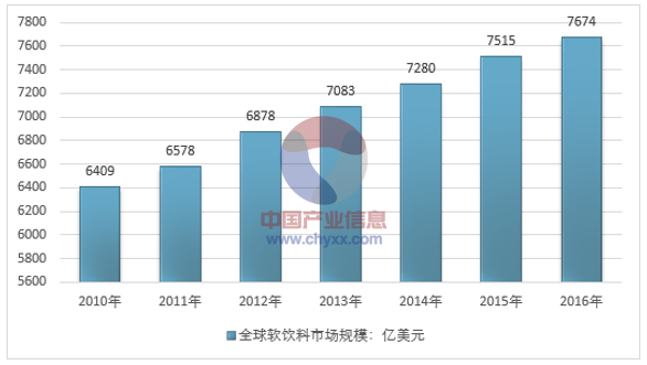2016年全球软饮料市场规模为7674亿美元,较2015年的7515亿美元增长2.1%。