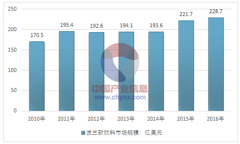 2010年波兰软饮料市场规模为170.5亿美元,2015年增长至221.7亿美元,2016年达228.7亿美元。