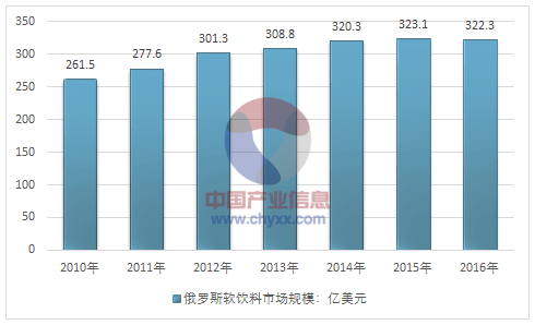 2010年俄罗斯软饮料市场规模为261.5亿美元,2015年增长至323.1亿美元,2016年达322.3亿美元。