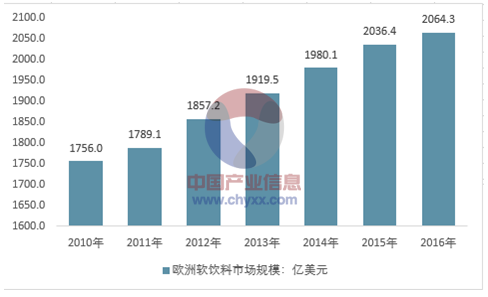 2010年欧洲软饮料市场规模为1756亿美元,2015年增长至2036亿美元,2016年达2064.3亿美元。