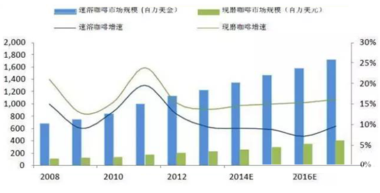 在新兴市场中,中国的消费增长尤为快速,由于中国咖啡市场规模基数小,每年增长率高达25%以上,超过世界平均水平的10倍。