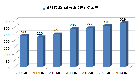 据Euromonitor发布的最新统计数据:2012年全球速溶咖啡市场规模达到292亿美元,2013年规模增长至310亿美元,2014年全球速溶咖啡市场规模达到329亿美元,同比增长6.12%。