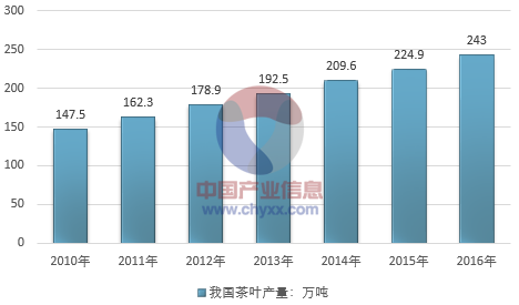 2016年我国茶叶产量为243万吨,比2015年增加18.1万吨,增长率为8%。