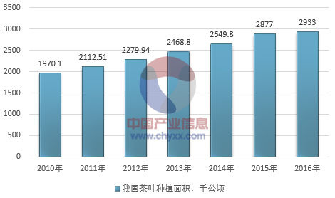 2016年我国茶叶种植面积为2933千公顷,比2015年增加56千公顷,增长率为1.95%。