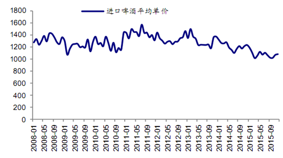 2008-2015年 中国进口啤酒平均单价(单位:美元/吨)