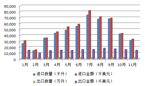 | 月份 | 进口数量(千升) | 进口金额(千美元) | 出口数量(万升) | 出口金额(千美元) |