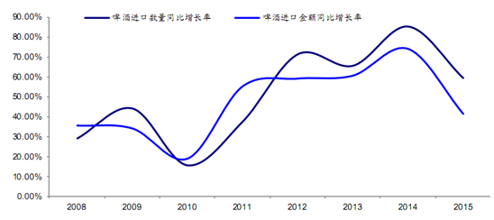 从进口啤酒数量和金额上看,高端啤酒消费市场依然高歌猛进。2008 年,我国进口啤酒 2.81 万吨,总金额 3712 万美元,到 2015 年,我国进口啤酒 53.83 万吨,总金额5.75 亿美元。但从增速来看,中国进口啤酒不论是数量还是金额都开始放缓,预计未来随着消费趋向理性,进口啤酒的优势将进一步减小。