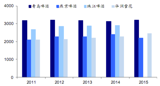 2011-2015年中国啤酒公司吨酒价(单位:元/吨)