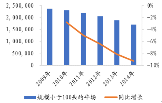 本阶段奶价基本保持持续增长,主要由于两个方面,一个是三聚氰胺事件后,政府出台政策,消费者信心逐渐回升,另一个是供给端结构性改革,散养户退出市场,养殖转向规模化,在调整阶段牛奶产量没有释放。中国政府在 2008 年以后出台一系列政策来扶持国产奶业并提高消费者信心,其中比较有代表性的政策有《原料乳与乳制品中三聚氰胺检测方法》,《乳品质量安全监督管理条例》,《奶业整顿和振兴规划纲要》,《生鲜乳生产收购管理办法》等。在政策的大力扶持下,国内消费者信心回升,乳制品消费量在 2010 年重新增长,增速超过 5%。另一方面,三聚氰胺事件以后,上游原奶供应商进行结构性改革,调整阶段牛奶产能无法释放。在结构性改革中,小户散养逐渐退出市场,2009 年到 2013 年规模小于 100 头的牛场数量保持持续下降。在 2010 年,虽然整体存栏量由于规模养殖的兴起增速超过 10%,但是存栏量的增加到产能释放需要一定时间,同时散户养殖的退出也造成了产量的直接下滑,牛奶产量在2010年下降超过2%,之后国内牛奶产量才开始逐渐回升。因此,在消费者信心回升和供给端结构性改革的双重作用下,本轮奶价整体呈现上升趋势。