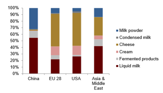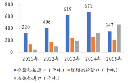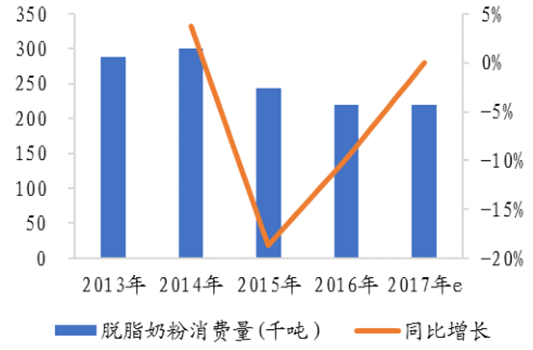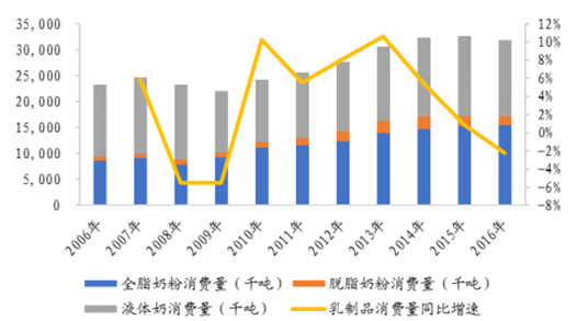 中国乳制品消费习惯接近东亚地区的韩国和日本,不同于西方国家,消费一般以液体奶和奶粉为主,对于黄油和奶酪等干乳制品消费较少。中国液体奶消费包含白奶和酸奶占据乳制品总消费的 65%左右,奶粉消费占总消费的 30%左右,其余是奶油、奶酪等干乳制品的消费。目前,国内总的液体奶消费量在 2015 年达到高峰后开始回落,增速已经下降。奶粉消费中,脱脂奶粉已经连续两年下滑,全脂奶粉增速也开始放缓。总体乳制品消费在 2015 年达到高位后,开始回落,根据预测 2016 年降幅达 2%。