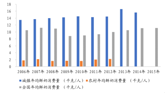 中国国内生鲜乳价格走势可大致划分为三个阶段,虽然每个阶段都有顶点和低点,但是人均 乳制品消费的快速增长成为原奶价格上涨动力,生鲜乳价格走势整体震荡上行。中国生鲜乳价格走势三个阶段分别是:第一个阶段 2006 年 6 月到 2009 年 8 月,第二个阶段 2009 年 9 月到 2012 年 9 月,第三个阶段 2012年 10 月到 2016 年 8 月。虽然国内生鲜乳价格受到上游产业链原奶供给的收缩和扩张的影响,但是在乳制品整体需求旺盛的情况下,乳制品消费量(还原原奶量)从 2006 年的 42 百万吨/年增长到 2016 年的 55 百万吨/年,生鲜乳价格也从 2006 年的不到 2 元/千克上涨到 2016 年底 3.53 元/千克。
