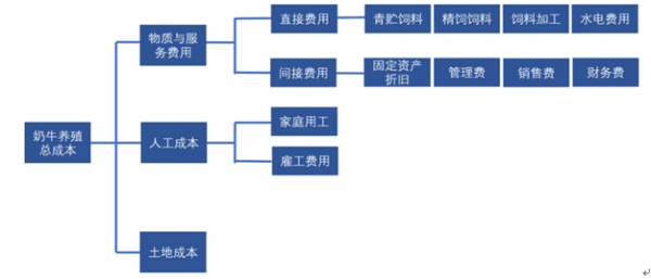中国国内奶农养殖系统性成本主要分为三个方面物质与服务费、人工成本和土地成本 ,其中物质与服务费中的饲料成本占据了奶农绝大多数成本 。人工成本和土地成本平均占总成本的 18%,物质与服务费用占到奶农的大多数成本。物质与服务费用包含直接费用和间接费用,直接费用主要由生产所需要的饲料费用和水电费等组成,间接费用包含管理、销售、财务和折旧等费用。其中饲料成本包含青贮饲料和精饲饲料占据了物质与服务费用的 90%左右,平均下来饲料成本占总奶牛养殖总成本的 74%。