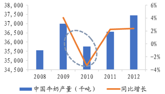 中国牛奶产量在 2010年骤减之后缓慢回升