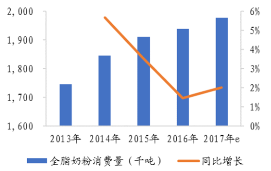 过去 10 年,国内乳制品消费的强劲增长带动了国内奶价的持续增长。现如今,在奶价低迷的影响下,牛奶产量开始出现负增长,国内偏高的库存奶粉也在被逐渐消耗。虽然国内消费增长已经开始放缓,不过未来消费升级、消费培养和二胎红利依然会使得消费需求保持增长,整体来说国内乳制品需求将会开始回暖,进口量也有望回升。在进口奶粉价格优势不再,国内原奶供需关系反转和奶农接近盈亏平衡点等多因素的影响下,国内奶价有望在 2017 年迎来新一轮上涨周期。
