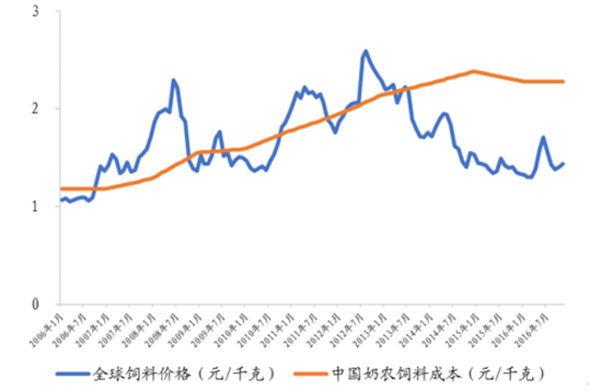 上游产业链奶农的主要成本是饲料成本,国内的奶农平均饲料成本远高于国际饲料价格指数,高饲料成本压缩了国内奶农的盈利能力。
