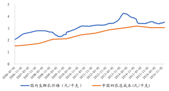 中国国内奶农使用的饲料主要是玉米、豆粕和苜蓿,2013 年后奶农饲养成本总体高于国际平均水平。根据《全国农产品成本收益资料汇编》数据,原奶生产每50 公斤平均成本从 2009 年逐年上升,从 2009 年的 106.32 元/50 千克(约 2.13元/千克)上涨到 2015 年的 153.10 元/50 千克(约 3.06 元/千克)。本报告根据2006 至 2008 年和 2016 年当年饲料价格和人工成本实际情况,预测 2006 年、2007 年、2008 年和 2016 年每公斤原奶平均成本为 1.57、1.72、2.08 和 3.06元。因为饲料成本平均占总成本的 74%,由此可以得到国内饲料成本指数。将国内饲料价格和国际平均饲料价格相比,可知 2013 年 8 月以后,国内饲料成本开始超过国际饲料成本。测算的数据显示 2016 年 11 月国内饲料成本为 2.28 元/千克,远超国际饲料指数 1.44 元/千克。因此,国内牛场养殖饲料成本的系统性偏高,严重挤压了奶农的盈利能力,使得国内奶农在面对低价进口奶粉冲击的时候被迫降低生鲜乳价格。