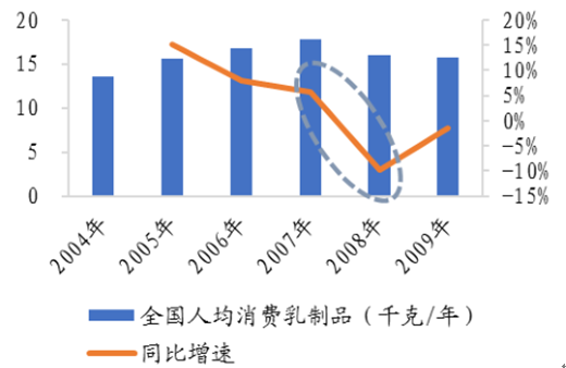 本阶段国内奶价下降是由于三聚氰胺事件爆发,乳制品信任危机造成消费的大幅减少。2008 年三聚氰胺事件爆发,消费者对国内乳制品消费信心严重不足,造成乳制品消费骤降。中国人均乳制品消费量在 2008 年降幅接近 10%,总乳制品消费量增速从 12%下降到 7%。对于乳制品消费信心的不足,是这轮奶价下跌的主要原因。