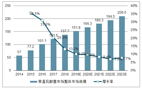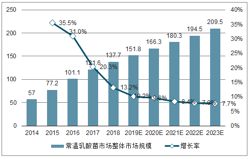 目前,从消费趋势看,常温乳酸菌饮品已进入发展的黄金时期,近年维持较高的增长态势, 是乳品企业抢夺市场的关键。2014-2018年五年间,国内常温乳酸菌饮品市场规模从 57.0 亿元增长至 137.7 亿元,复合增长率为 24.7%。未来 5 年内,随着宏观经济增长趋缓、常温乳酸菌饮品市场逐步饱和,常温乳酸菌饮品市场增速将有所放缓,预计至 2023 年,国内常温乳酸菌饮品市场有望达 209.5 亿元。