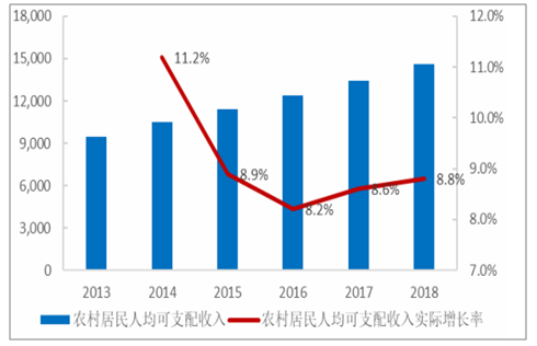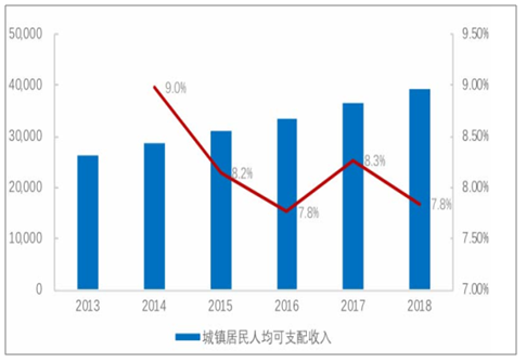 居民收入决定了包括食品支出在内的消费结构。自 1979 年以来,我国居民人均可支配收入伴随着 GDP 的增长而不断提升。我国城镇居民可支配收入在2013 年为 26,267 元/年,而 2018 年底达到 39,251 元/年,年均复合增长率为 8.36%;我国农村居民家庭人均年可支配收入在 2013 年为 9,430 元/年,而2018 年底达到 14,617 元/年,年均复合增长率为 9.16%。国民收入的快速增长,为食品饮料消费的增长提供了经济基础。