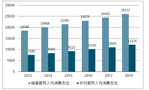 2013-2018 年间,城镇居民家庭人均年度消费支出占可支配收入比例约为70%,农村居民家庭人均年度消费支出占可支配收入比例约在 80%附近,整体保持稳定。其中,食品支出(恩格尔系数)约占人均年度消费支出的三分之一,整体消费结构较为稳定。随着人均收入的提升,食品支出预计也将保持稳定的增长态势,具有较大增长空间。
