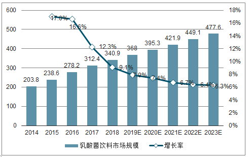 近年来,我国乳酸菌饮品市场保持了较为快速的发展,2014-2018 年,乳酸菌饮品保持了 13.7%的平均复合增长率,至 2018 年市场规模约为 340.9 亿。未来乳酸菌饮品市场将保持持续稳定的发展,预计 2023 年有望达到 477.6 亿的规模。