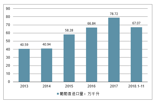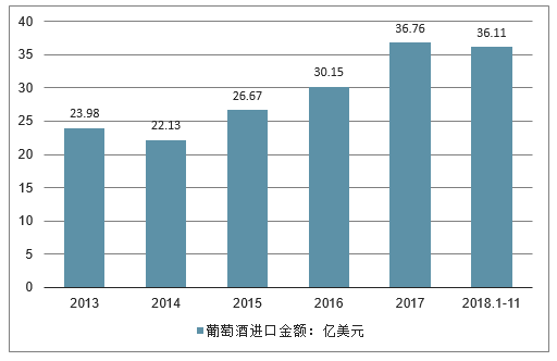 进口量增长,葡萄酒进口金额也有所增加。2013年葡萄酒进口量23.98亿美元,2016年突破30亿美元,2017年达到36.76亿美元。2018年1-11月葡萄酒进口金额达到36.11亿元,比肩2017年全年进口金额,与2017年同期相比,葡萄酒进口金额上涨10.1%。预计2018年全年葡萄酒进口金额有望突破40亿美元。