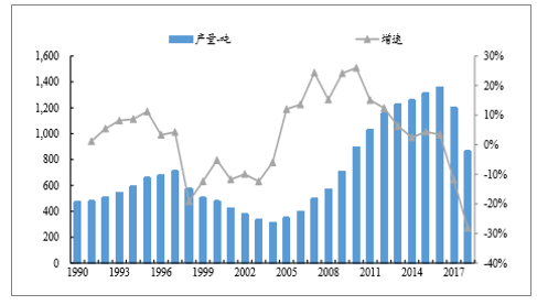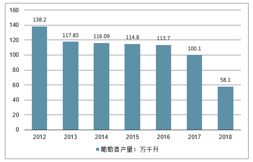 2012年以来,国产葡萄酒行业进入调整期,总产量连续下滑,到2017年已是连续第5年,但是基本维持在110万千升左右。2017年产量达到100.1万千升,同比减少5.3%。2018年1-11月葡萄酒产量58.1万千升,同比减少7.0%。2017年12月葡萄酒产量仅16.1万千升,由此看来,2018年葡萄酒产量将跌破100万千升。