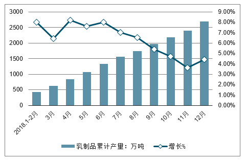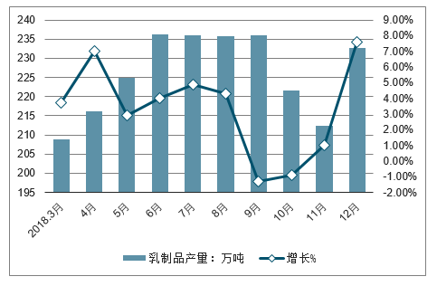 2018年1-3季度全国乳制品产量呈小幅度增长,增长幅度有所减缓;2018年3季度全国乳制品产量相比1季度增长10.75%。2018年12月全国乳制品产量为232.8万吨,同比增长7.6%。2018年1-12月全国乳制品产量为2687.1万吨,同比增长4.4%。