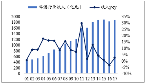 2008-2013年产能扩张与并购热潮的后半段,行业规模继续扩大。改革开放后,啤酒产业开始迅速发展,在80年代导入期后,90年代国内资本加大产能投建,啤酒行业产量由1992年的1020万吨快速增加至2000年的2300万吨;2000年后外资以资本并购为主要手段进入我国啤酒行业并带来鲶鱼效应,行业迎来并购热潮,至2008年形成清晰的三大梯队阵型。至此,行业产量规模以每年保持双位数的速度快速扩大。而进入2008年,行业延续“大吃小”的并购热潮,但产量增速降至个位数,但随着第一二梯队企业持续的产品结构升级,行业收入多数年份呈现双位数增长,行业保持较高景气度。
