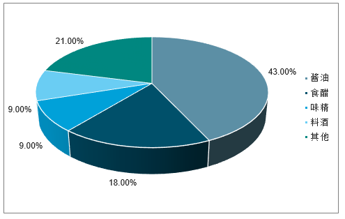 我国常用调味品按照形态不同,可以分为酿造类、腌菜类、鲜菜类、干货类、水产类等;再具体细分为酱油、耗油、食醋、料酒、味精、榨菜等。其中,酱油行业产销量和企业规模均居调味品行业首位,2016年酱油消费量占调味品总消费量的43%;2017年酱油销量为1001万吨,同比增长5.1%,略高于调味品平均增速。