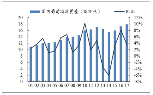 受益于个人及商务消费,景气度有所回升。2012-2014年同样受三公消费限制影响,高端葡萄酒消费难以幸免,行业景气度、下滑明显。20152017年三公消费逐渐出清、对行业整体影响淡化,个人及商务消费带动行业呈现弱复苏态势,维持小个位数增长,2017年葡萄酒消费量勉强达到2012年高峰水平。行业走出低谷、缓慢爬升,但相对于白酒第一大酒精饮料地位而言,葡萄酒消费有望保持相对稳定水平。