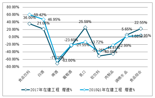 2017-2018Q1 食品饮料行业在建工程增速走势
