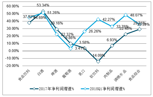 食品饮料板块的业绩增速和产能投入增速匹配,形成良性循环。2018年一季度,食品饮料板块收入和净利润同比增长16.5%和44.69%,在建工程同比增长59.42%,三项指标均高于2017年水平,说明食品饮料板块的投入和产出较为景气,供需匹配度较好,未来持续稳定增长有保障。