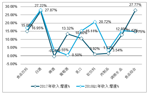 白酒板块表现一枝独秀,2017年和2018年一季度的业绩增速和在建工程增速保持在较高水平,且2018年一季度的在建工程增速为47%,远高于2017年21%的水平,说明行业产销互动良好,未来产能提高还有看点。