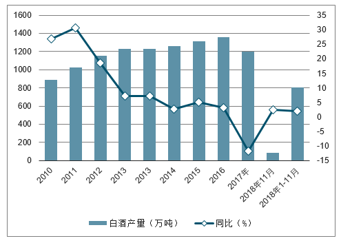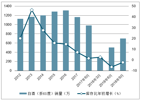2010-2018年中国白酒(折65度)销量及库存比年初增长走势