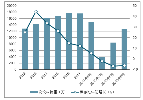 2010-2018年中国软饮料销销量及库存比年初增长走势