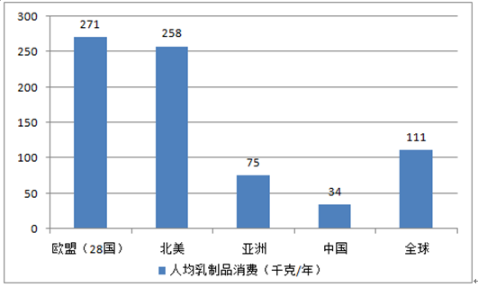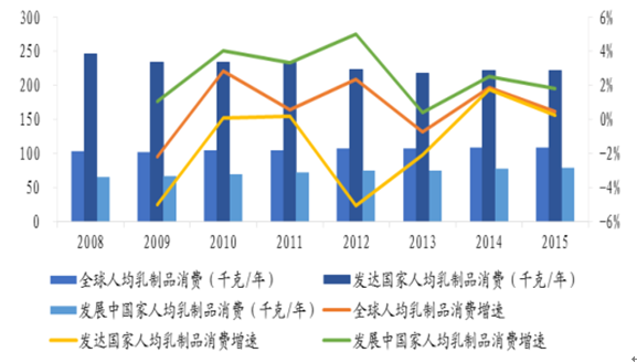 全球乳制品终端消费决定乳制品的需求。近年来,全球乳制品人均消费基本处于不断上涨的趋势。虽然 2008 年全球金融危机和 2010 年欧盟债务危机影响了发达国家乳制品消费的恢复和增长,但是发展中国家(特别是中国等新兴市场)乳制品消费的强劲增长带动了全球乳制品消费的不断增长。2015 年,主要发达国家人均乳制品消费平均高于250千克/年,亚洲人均乳制品消费只有75千克/年;可见,中国等发展中国家乳制品消费仍有较大的增长空间。