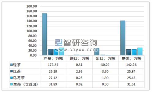 2018年我国绿茶进口数量为0.31万吨,出口数量为30.29万吨,我国绿茶表观消费量为142.26万吨;2018年我国红茶进口数量为2.95万吨,出口数量为3.30万吨,我国红茶表观消费量为25.84万吨;2018年我国乌龙茶进口数量为0.23万吨,出口数量为1.90万吨,我国乌龙茶消费量为25.45万吨;2018年我国黑茶进口数量为0.02万吨,出口数量为0.30万吨,我国黑茶消费量为31.61万吨。